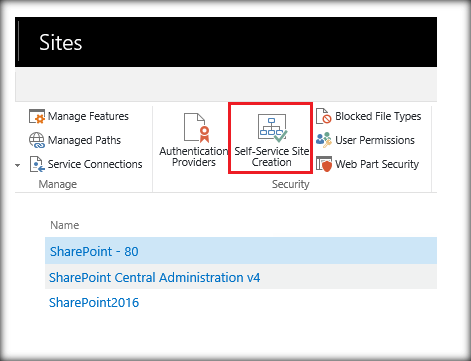 Head over to the "Manage Web Applications" page, select the specific web application, and click on ‘Self- Service Site Creation’ page.