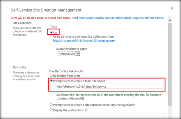 Change the radio button to ‘On’ and select the option ‘Prompt users to create a team site under’. Also, mention the managed path under which the site collections will be created. I have mentioned it as “sites/SelfService”. You can also select the option ‘Prompt users to create a site collection under any managed path”. However, this would lead to a situation where users can create site collections randomly within the web application and over time, it can spin out of control. It is always better to restrict the users to create site collections under a specific managed path.
