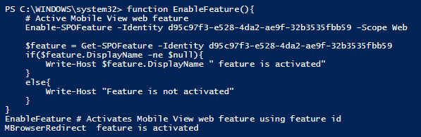 -     Enable-SPOFeature -Identity d95c97f3-e528-4da2-ae9f-32b3535fbb59 -Scope Web