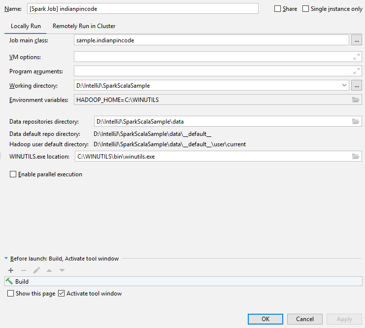 - val sparkSession: SparkSession = SparkSession.builder.master("local").appName("Scala Spark Example").getOrCreate()