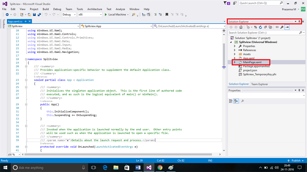 It takes some time to create a Windows application. Once the project creation is successful, you will be redirected to App.Xaml.cs.