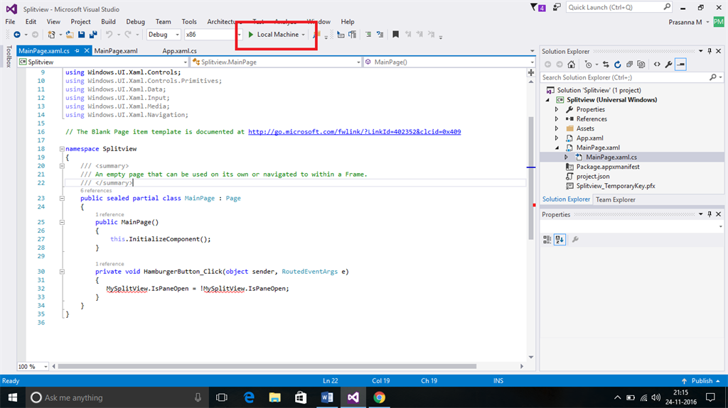 Go ahead and open MainPage.Xaml from Solution Explorer. Now, switch code page into the designer page.