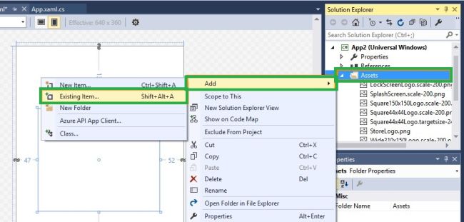 In the MainPage.xaml designing page, go to the Solution Explorer and right click on Assets and choose Add->Existing Item.