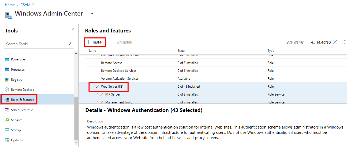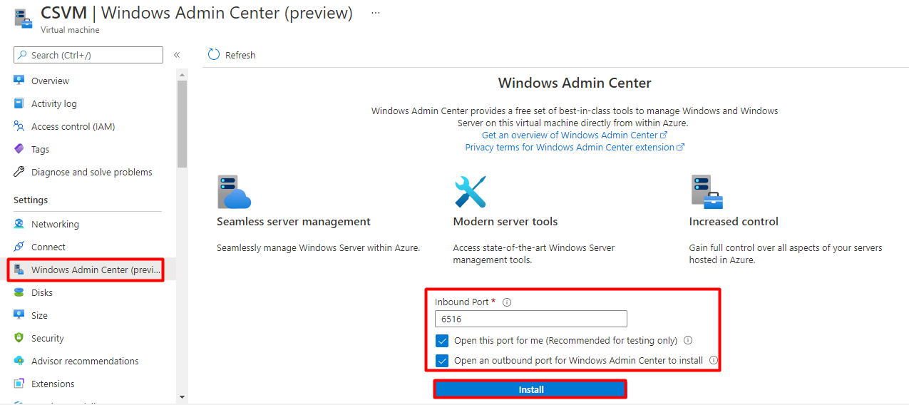 Click Windows Admin Center (preview), and then click on the Install to start the Windows Admin Center configuration.