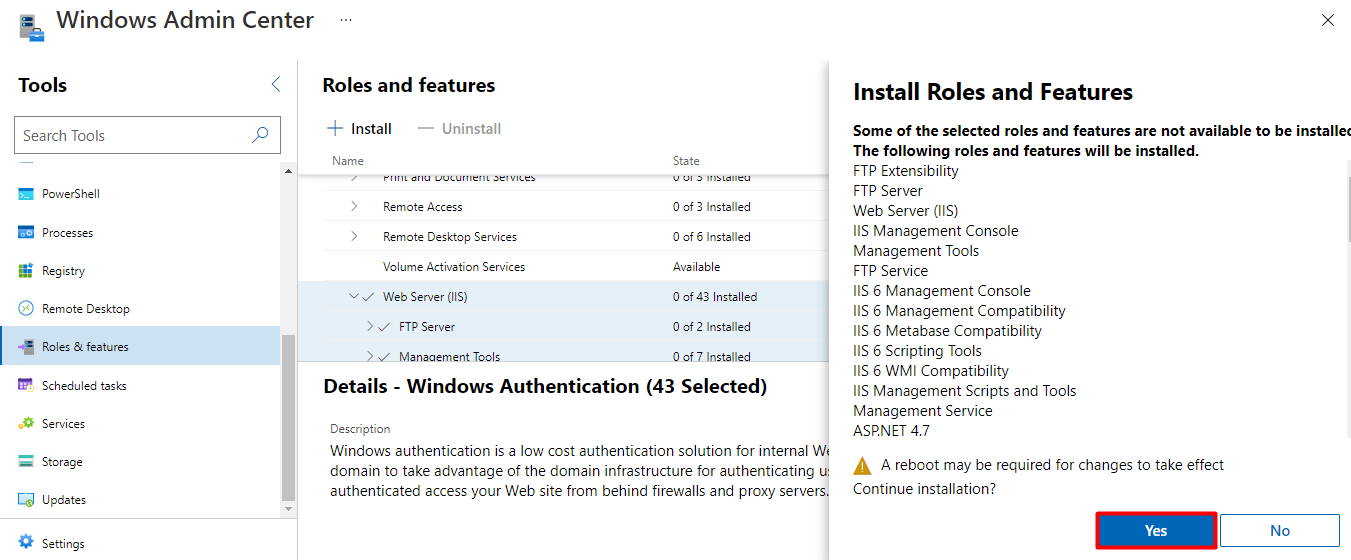 In the Install Roles and Features confirmation, select Yes to continue the installation.