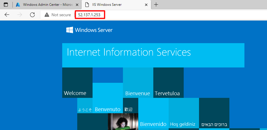 We can copy the Public IP address from the virtual machine and paste it to the browser, now we can see the IIS Windows Server landing page.