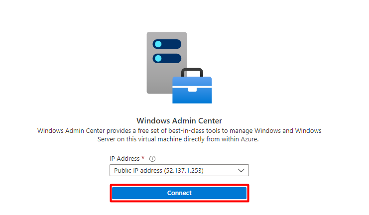 Now the Windows Admin Center (preview) has been successfully deployed, select the Public IP address in the dropdown menu and then click on Connect.