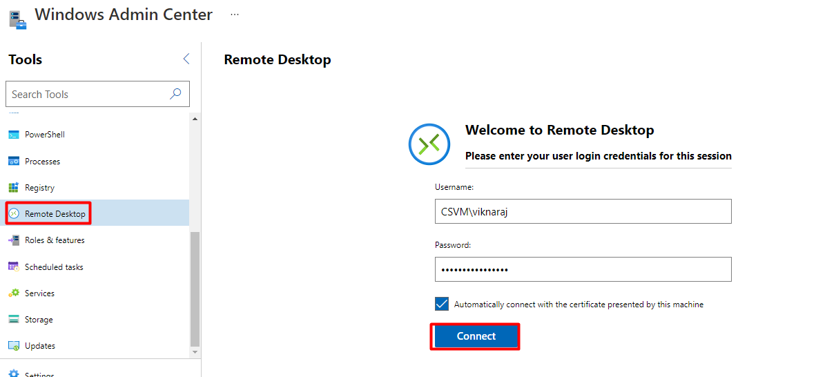 If you want to access the Virtual Machine’s Desktop we can select the Remote Desktop option and enter the Username and Password and then click on Connect.