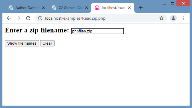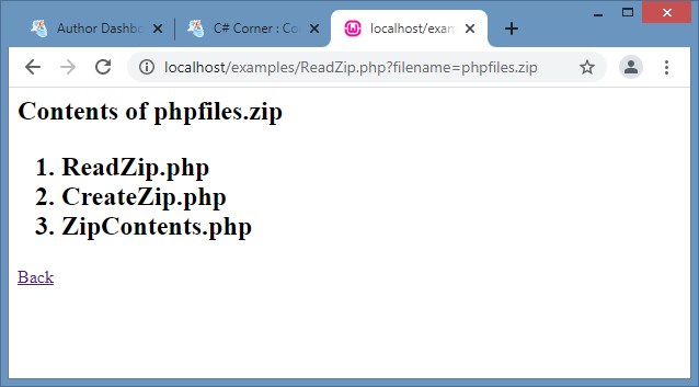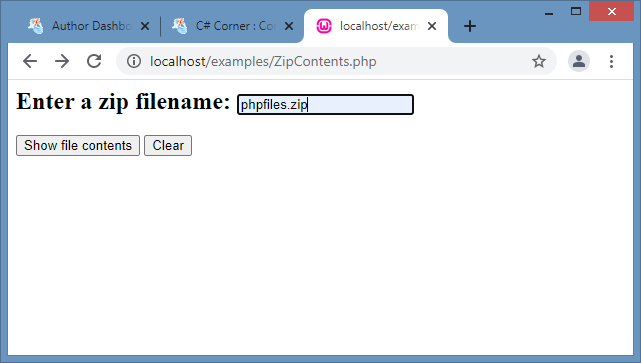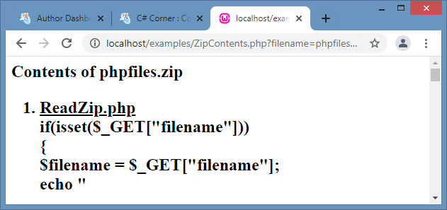 To view the contents files within a zip file, we need to first create an object of the ZipArchive class and invoke the open() function passing the zip file name as a parameter. The numFiles property can be used to know the number of files in the archive. The getNameIndex() method returns the name of an entry in the zip file using its index. The getFromIndex() method returns the file contents using its index. The following sample code can be used to view all the file names and their contents in a zip archive by iterating over all files.