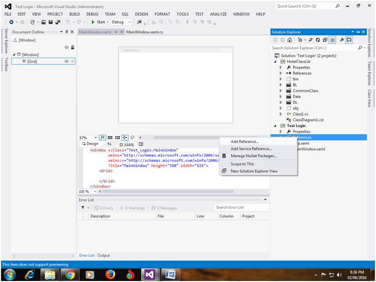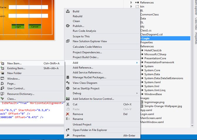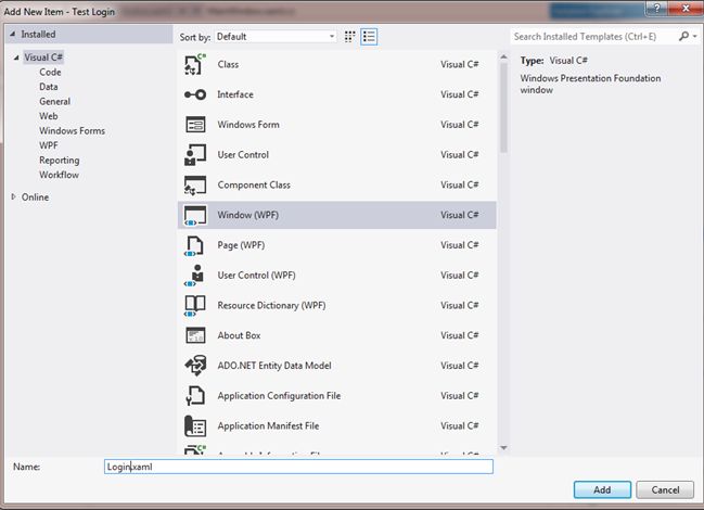 - Right click the project -> Add -> New Item -> select Windows(WPF) -> name it as Login.xaml.