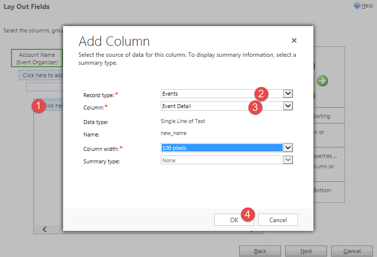 - Next, click report area and other columns from the event entity. For example, event detail, city, date, budget.