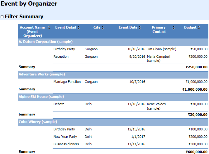 We have one custom entity event, which stores the details about the events, like event budget, event organizer, primary contact, event city and date. We want to write a report, which should display the events group, by an event organizer.