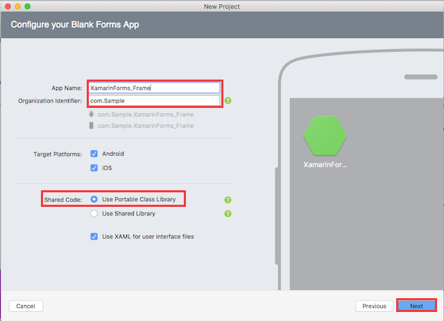 In this step, configure your app. Give the App name (Ex: sample) and Organization Identifier. Afterwards, click "Next".