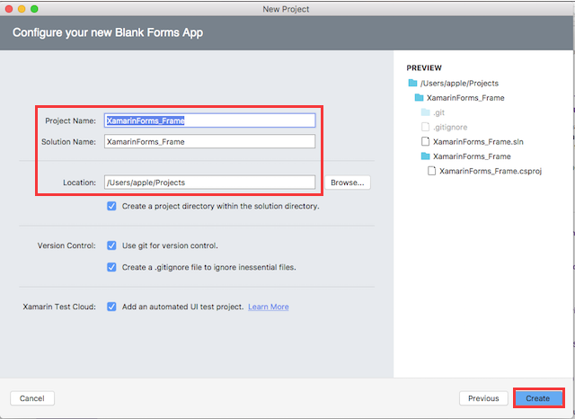 In this step, give your project name (Ex: Sample) and solution name (Ex: Sample). Give the path to your project. Afterwards, click "Create".