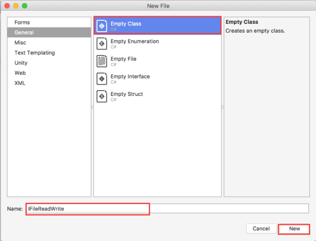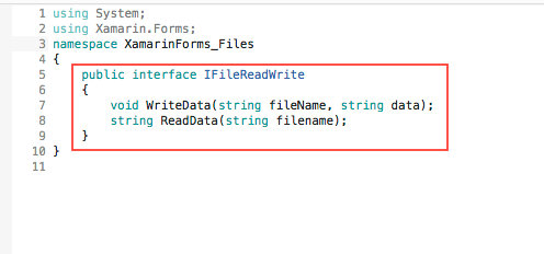 Create an interface in Xamarin.Forms PCL. Go to Solution—>PCL—>Right click—>New—>Empty Class—>IFileReadWrite.cs.