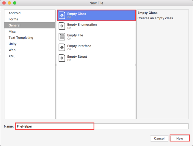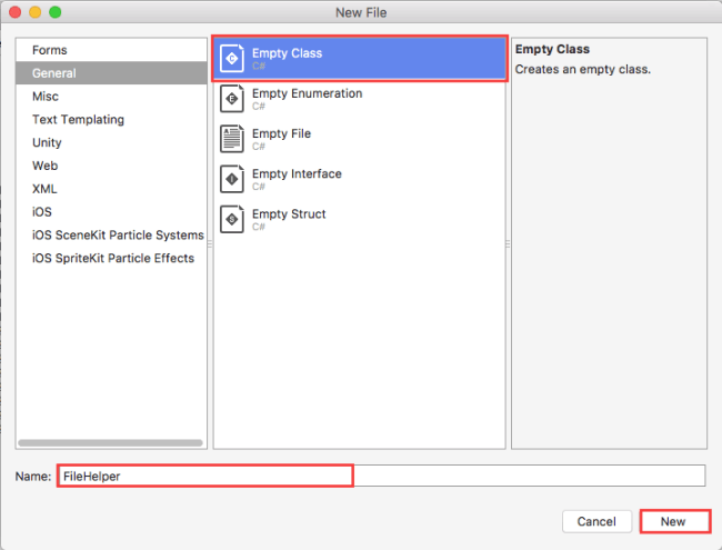 Go to Solution—>iOS—>Right click—>New—>Empty Class—>FileHelper.cs. Now, write the following code.