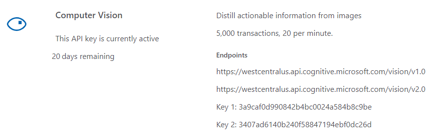 Computer Vision services require special subscription keys. Every call to the Computer Vision API requires a subscription key. This key needs to be either passed through a query string parameter or specified in the request header.