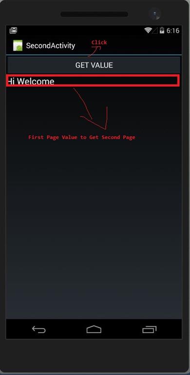 - Second Screen to Press Get Button to Retrieve the passing value of “Hi Welcome” to display TextView.