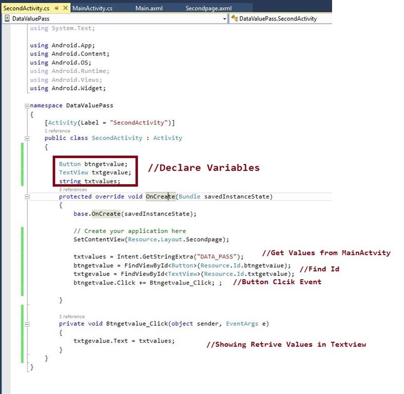 Step 11 - Next to open Solution Explorer-> Project Name->SecondActivity.cs click to open Code Window, then give following code,