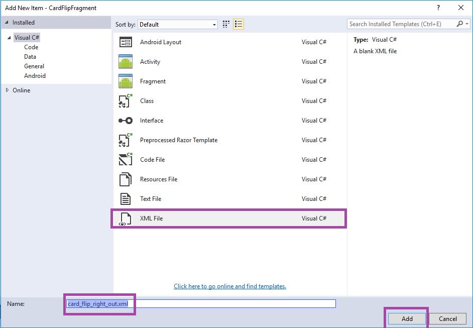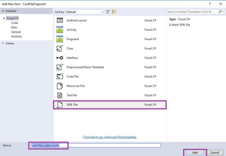 Step 5: Here, we will create four animations. Thus, we create XML resource. Go to Solution Explorer-> Project Name-> Resources-> Anim. Right click to Add-> New Item and open a new dialog box. This dialog box is required to select XML and give the name for Card_flip_left_in.xml, Card_flip_left_out.xml, Card_flip_right_in.xml and Card_flip_right_out.xml.