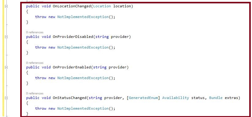 - public class MainActivity: Activity, ILocationListener