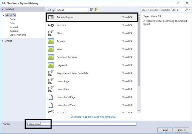 Go to Solution Explorer-> Project Name->Resources->layout, then right click to Add->New Item. This opens a new Dialog box where you need to select Android Layout and give names as Success.axml and Failure.axml.