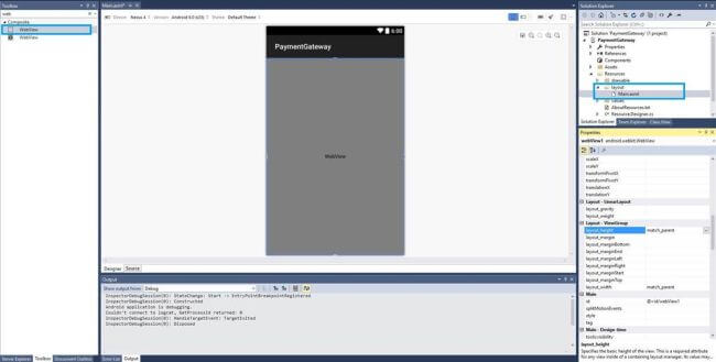 Next,open Solution Explorer-> Project Name->Resources->Layout->Main.axml and click to add WebView.