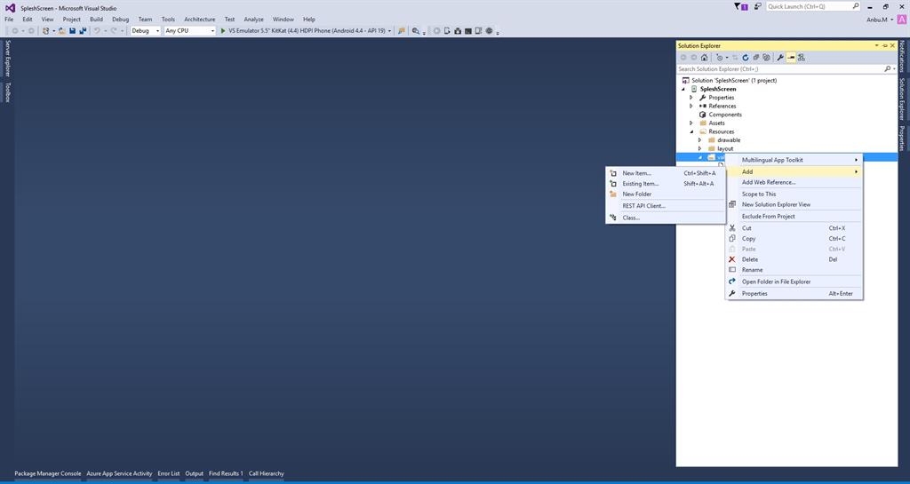 Again go to Solution Explorer, Project Name, Resources, Values then Right Click to Add->New Item. Open new Dialog box and then that dialog box to select XML File. After that give name colors.xml.