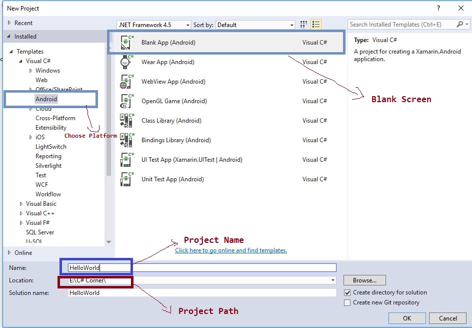 Step 1: Open Visual Studio->New Project->Templates->Visual C#->Android->Blank App