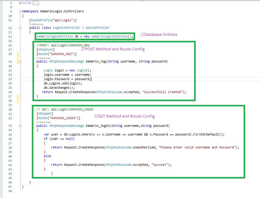 Then Open once you have created ControllerName.cs. Here you create two methods, Xamarin_reg and Xamarin_login.