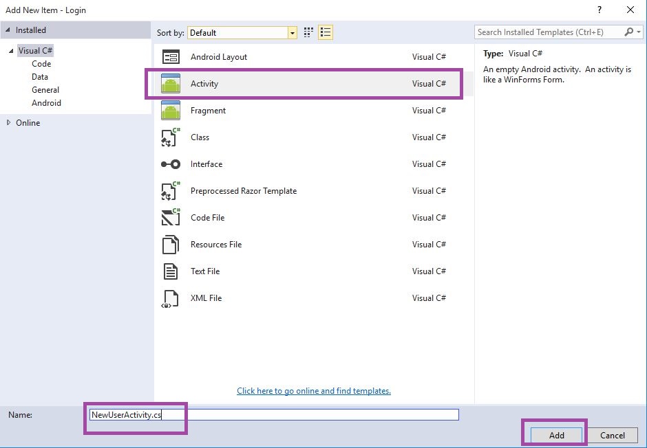Next go to Solution Explorer-> Project Name then Right Click to Add then open new Dialog box. Then select Activity give name for NewUserActivity.cs after that Add the New Activity Class.
