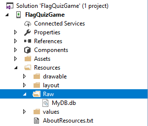 Open Solution Explorer-> Project Name -> Resources Right click add a new folder give it a name like, Raw and paste your database file in to it.