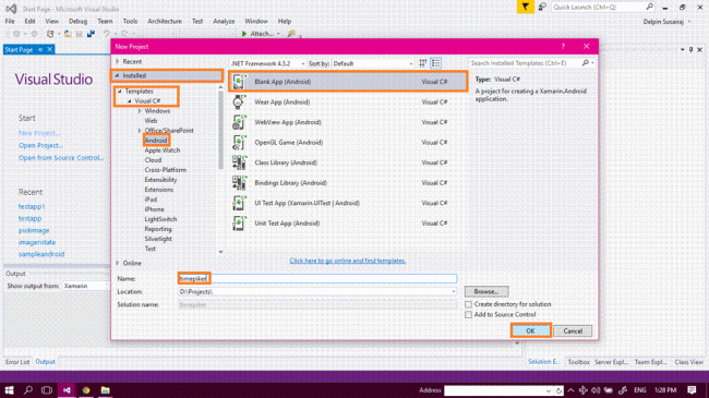After opening the New Project, select Installed-->Templates-->Visual c#-->Android-->choose the Blank App (Android).