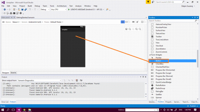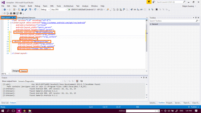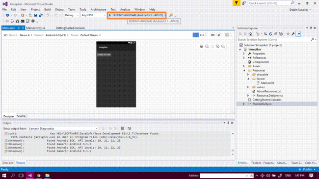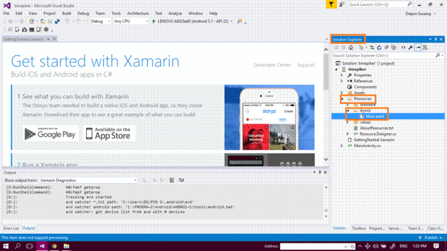Next, go to the Solution Explorer. Select Resource-->Layout-->double click to open main.axml page. Select either Design View or Code View to design your app.
