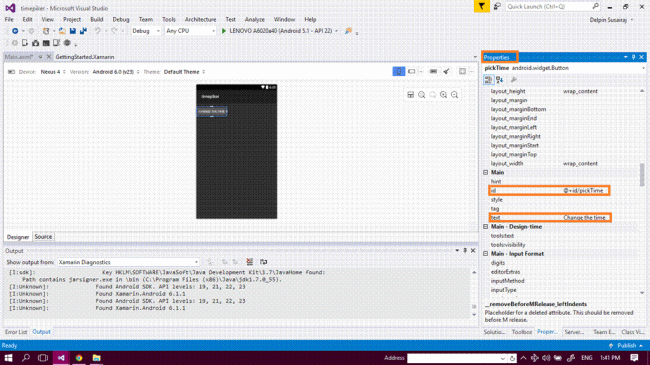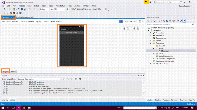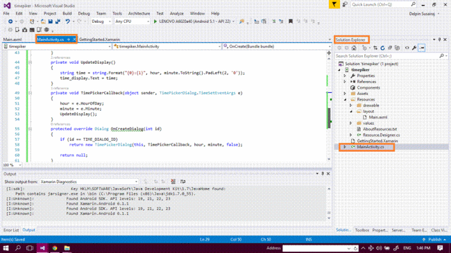 The following steps need to be followed in order to pick a time in Android app, using VS 2015.