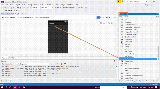 And also, edit the TextView properties or note the values in main.axml page source tap.