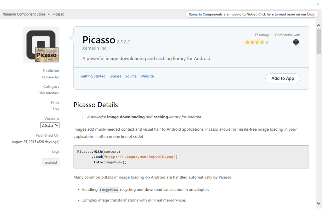 Next, we need to add a more component that is required for caching images from web. Open Solution Explorer and go to Components -> Get More Components. In this way, you can move on Xamarin Components Store, then search for Picasso and click "Add to App".