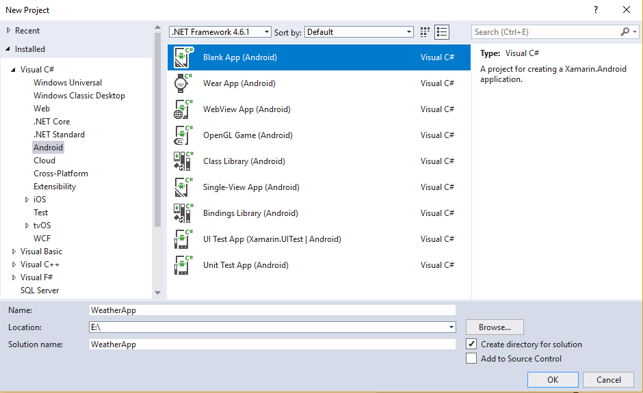 Open Visual Studio and go to New Project-> Templates-> Visual C#-> Android-> Blank app. Give it a name, like WeatherApp.
