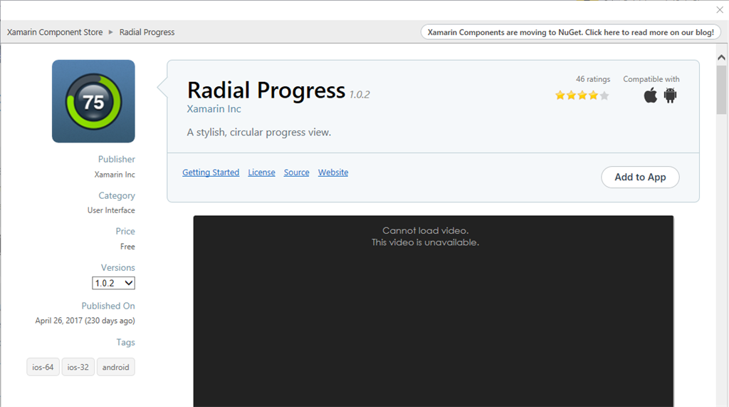 Go to Solution Explorer-> Components -> then Right Click-> Get More Components. In this way, you can move on Xamarin Components Store, search for Radial Progress, and add that to the app.