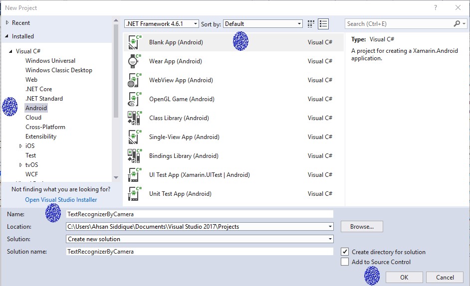 Open Visual Studio. Go to New Project-> Templates-> Visual C#-> Android-> Blank app. Select Blank app. Give the project