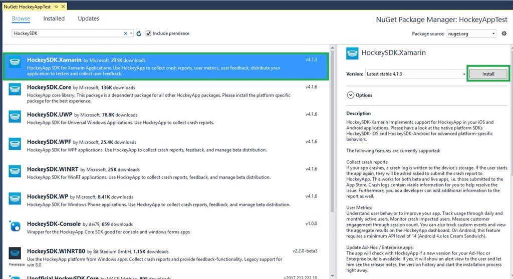 Go to Solution Explorer-> Project Name-> References, followed by right click to Manage NuGet Packages. Open new Dialog box. This dialog box is required to search HockeySDK, followed by installing HockeySDK.Xamarin Packages.