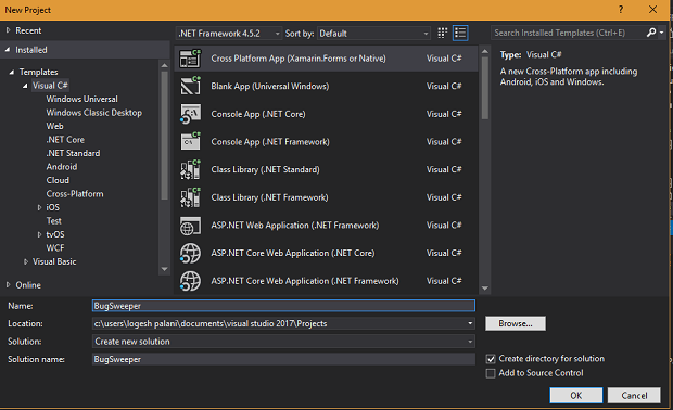You can create Xamarin.Forms app by going to File >> New >> Visual C# >> Cross-platform >> Cross-Platform App (Xamarin.Native or Xamarin.Forms), enter desired name for your project, and press OK.