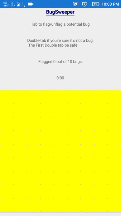 This is a familiar game with a new twist. To win, you must find and flag all ten bugs. Ten bugs are hidden in a 9-by-9 grid of tiles.That first double tab is always safe. Thereafter, numbers indicate the number of surrounding tiles with bugs. Flag it with a single tab. Avoid double-tabbing a tile with bug!.