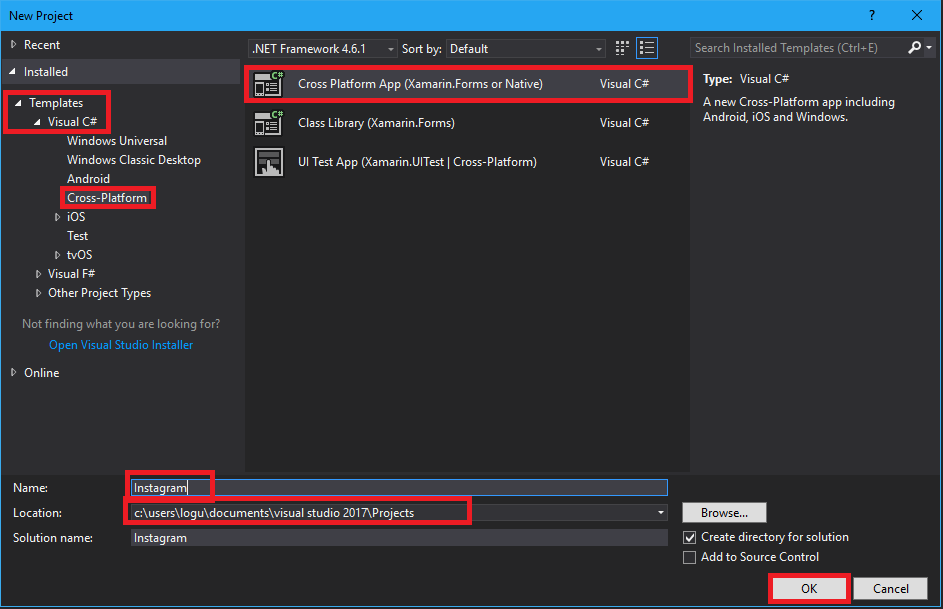 Select Cross Platform App (Xamarin.Forms or Native) and give your application a suitable name, such as - Instagram.