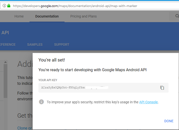 Afterwards, you must generate an API key and add it to your Android project. Follow this instruction for generating the API key.