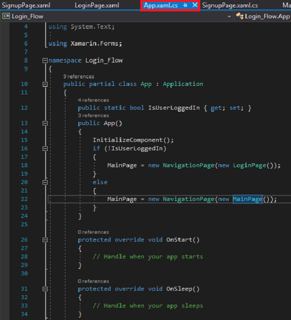 After the design view creation, go to Solution Explorer>>Login_Flow(PCL)>>click open App.xaml.cs and declare the MainPage is LoginPage.xaml. If the application is already logged in, the userr is directly navigated to MainPage.xaml.