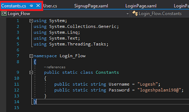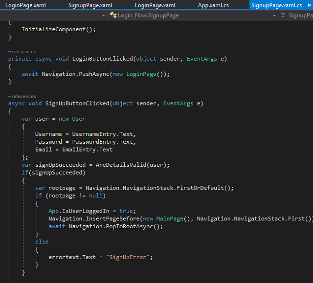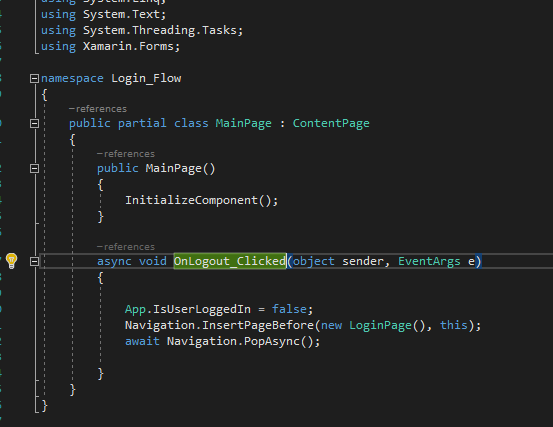 After this, go to Solution Explorer>>Login_Flow(PCL)>>MainPage.xaml.cs and insert the code given below.