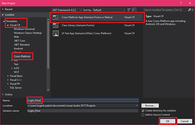 Select CrossPlatform App(Xamarin.Forms or Native) and give the application a suitable name, such as Login_Flow.