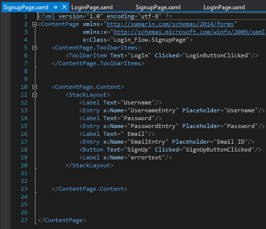 In this step, open Solution Explorer>>Login_Flow(PCL)>>SignupPage.xaml.cs page and double-click to open design view. Here, the code is given below.
