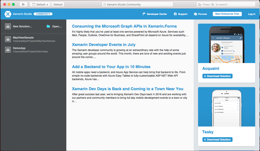 - Create a new Application in Xamarin Studio by selecting New Solution from the the welcome screen.